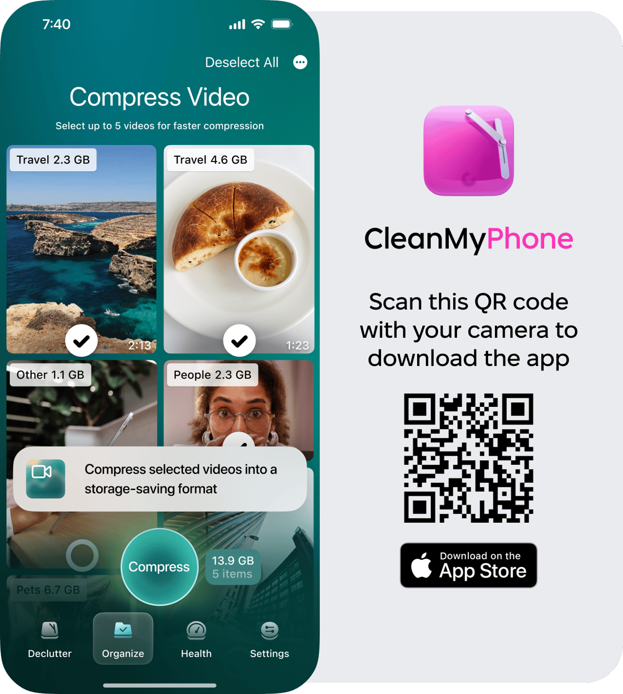 当您无需手动滚动浏览每一张照片和视频时,整理照片和视频就变得非常容易。让 CleanMy®Phone 对它们进行排序,以便您可以快速删除不需要的内容。