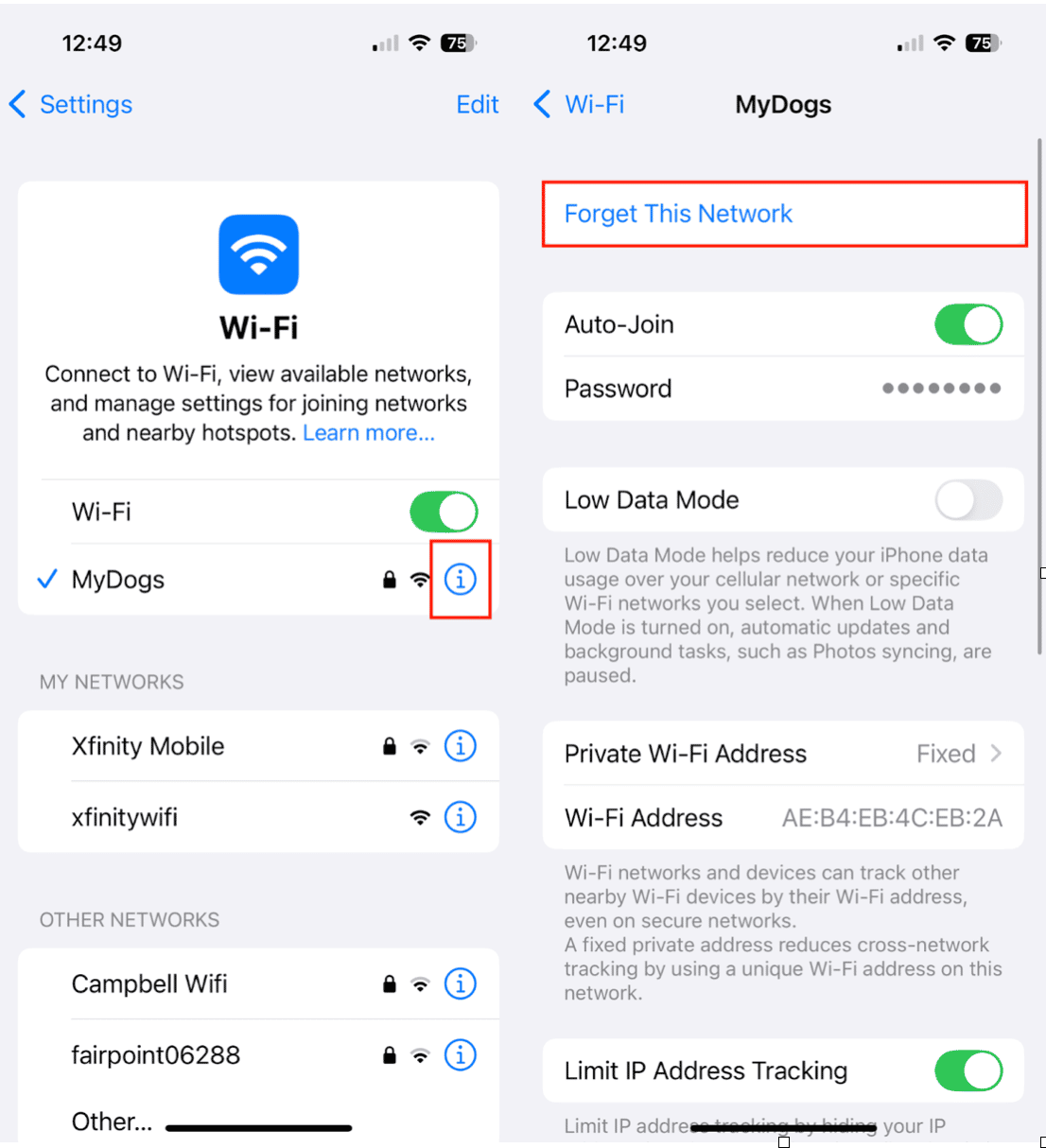 - 忘记并重新连接到 Wi-Fi 网络(设置 > Wi-Fi > 点击“i”图标 > 忘记此网络)。