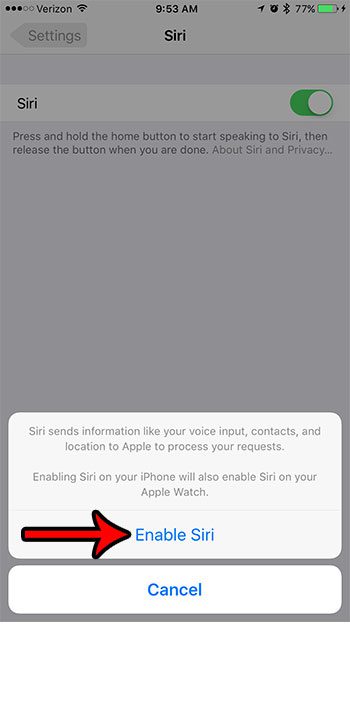 如果 Siri 被禁用,请点击其右侧的按钮将其打开。然后您将看到下面的屏幕,要求您确认是否要在 iPhone 上启用 Siri。