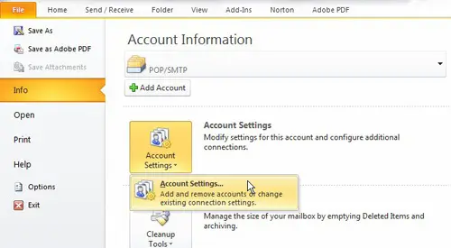 启动 Microsoft Outlook 2010,然后单击橙色文件窗口左上角的选项卡。点击信息在窗口左侧,单击账户设置按钮位于窗口中央,然后单击账户设置再次在下拉菜单中。如果您的 Outlook 配置文件中有多个电子邮件帐户,则需要从窗口顶部的下拉菜单中单击正确的帐户,以确定该帐户的 PST 文件的位置。