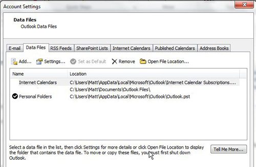 这将打开一个账户设置弹出窗口。单击数据文件顶部的选项卡账户设置窗口,其中将显示与当前 Outlook 配置文件关联的所有数据文件的列表。