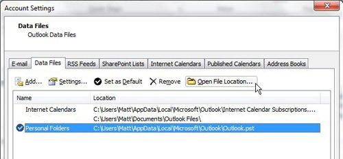 PST 文件的位置显示在窗口中央的“地点柱子。如果您想直接转到 PST 文件位置,请单击所需的 PST 文件以使其突出显示,然后单击打开文件位置数据文件列表上方的按钮。