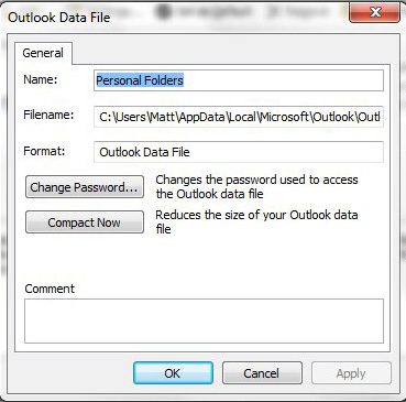 这将直接打开 Windows 资源管理器到 PST 文件的位置。您还可以在选择所需的 PST 文件时单击“设置”按钮,这将打开一个标题为“Outlook 数据文件。您可以使用此窗口执行各种其他操作,例如更改 Outlook PST 文件的密码,或者压缩 PST 文件(如果它太大)。