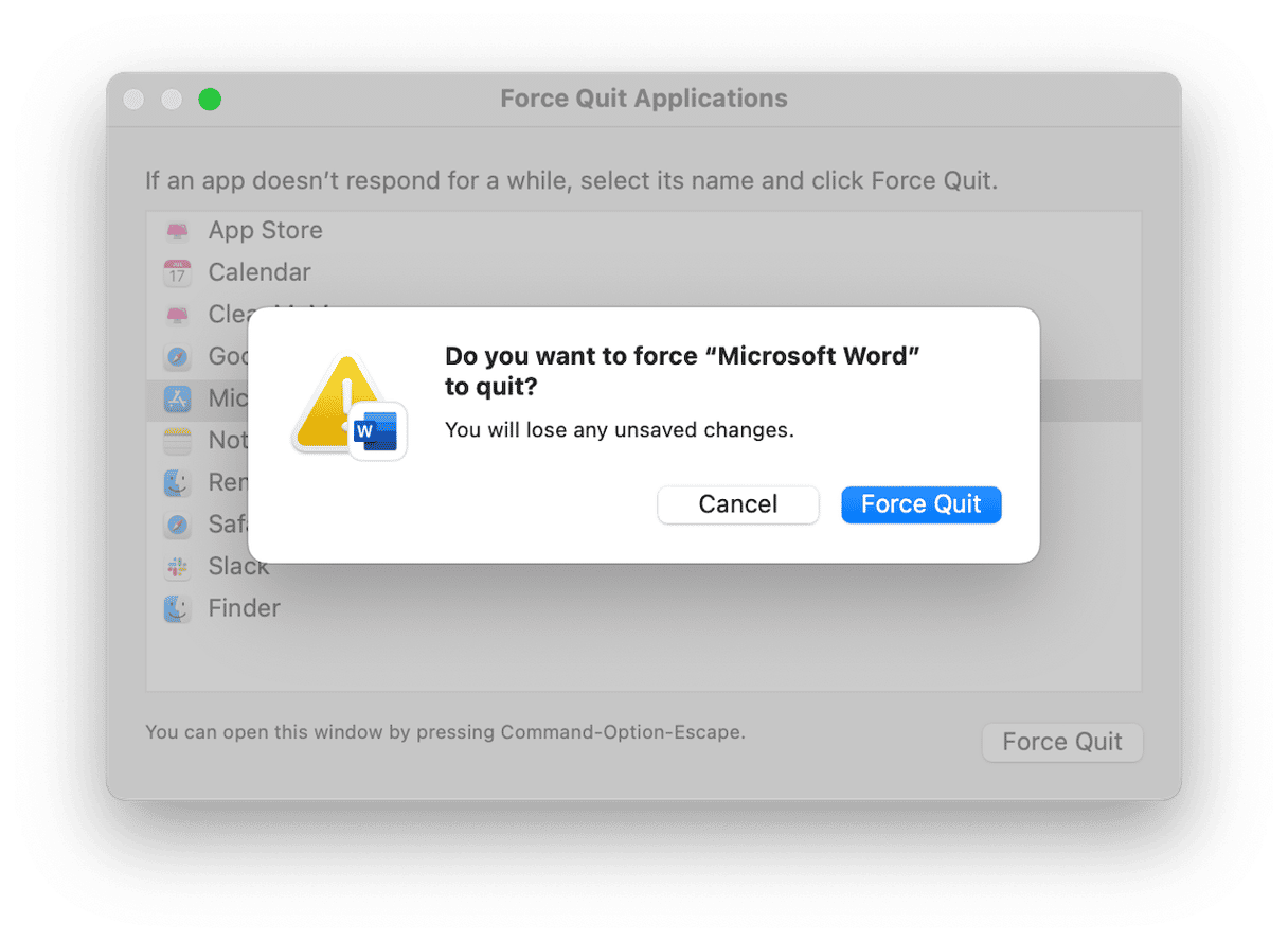 - 按 Command+Option+Escape,选择 Word,然后单击“强制退出”。