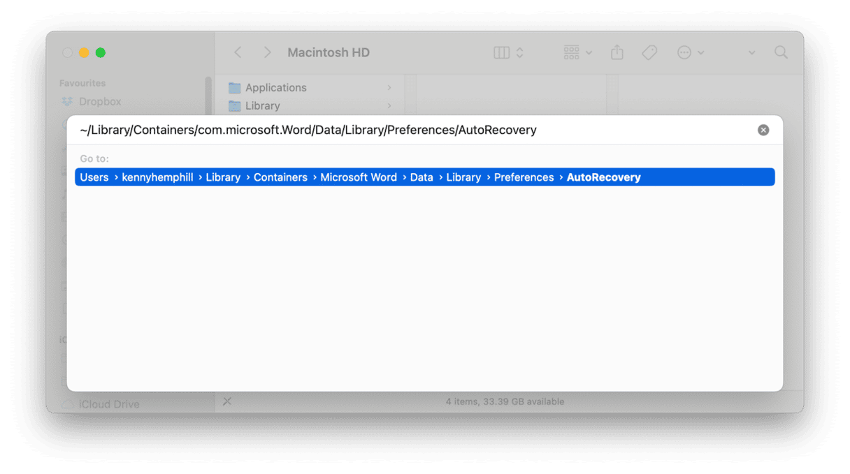 - 在文本框中,粘贴此路径并按 Return 键:~/Library/Containers/com.microsoft.Word/Data/Library/Preferences/AutoRecovery