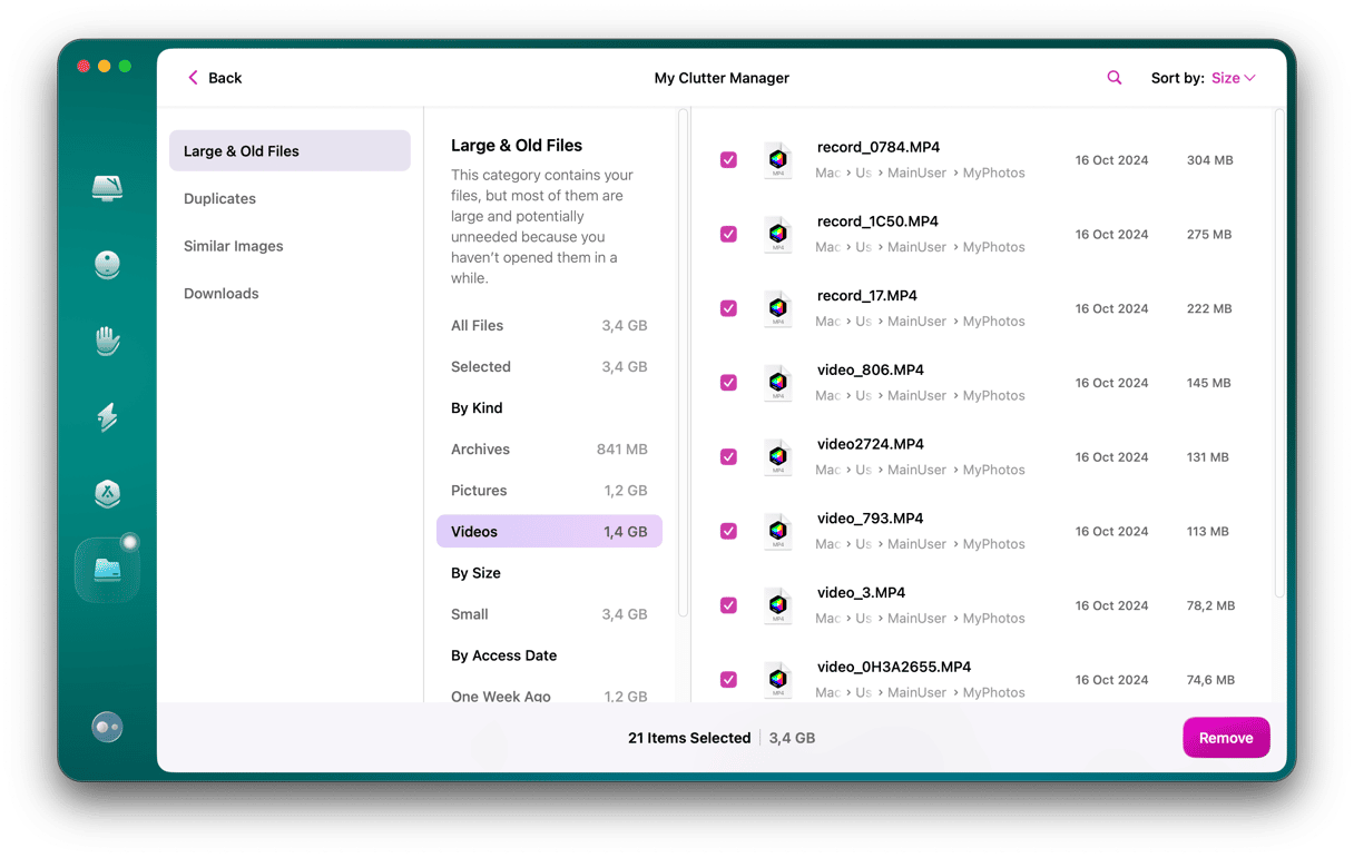 虽然上面的技巧有效并且确实有用,但需要大量的手动挖掘,并且有局限性。老实说,我通常会避免手动扫描整个 Mac,因为很容易错过隐藏在模糊文件夹中的内容。 CleanMyMac 附带了一个名为“我的杂乱”的有用功能,它可以在几分钟内清理您的整个系统,按大小和类型列出所有文件,甚至可以显示上次访问的文件,以便非常简单地删除。它的工作原理如下: