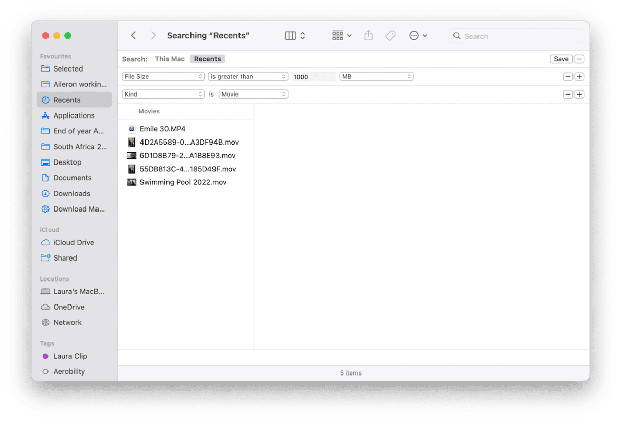 我使用 Finder 的内置搜索过滤器来查找大型媒体文件;方法如下: