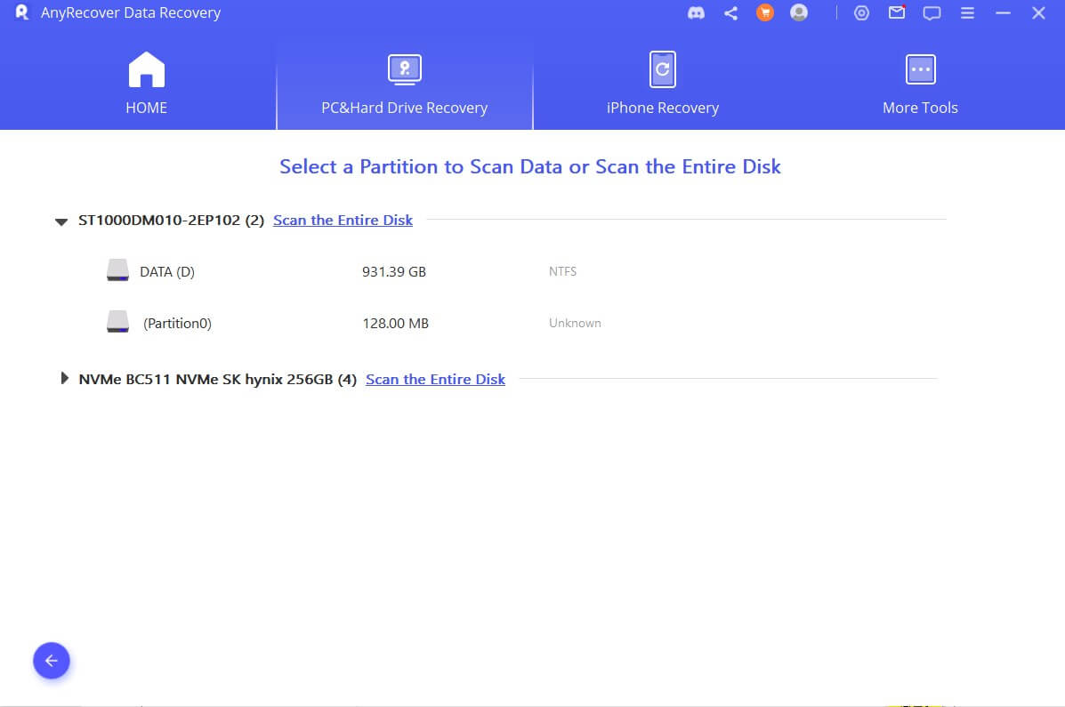你可以尝试从以下位置扫描它找不到位置。您的所有硬盘和分区都会显示在这里,您还可以在这里执行全盘扫描。