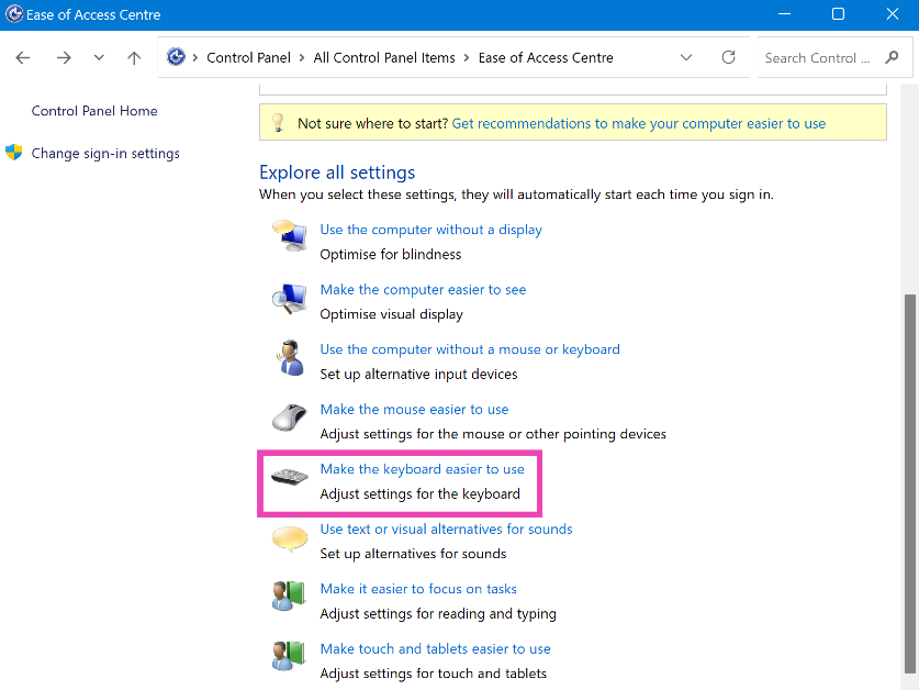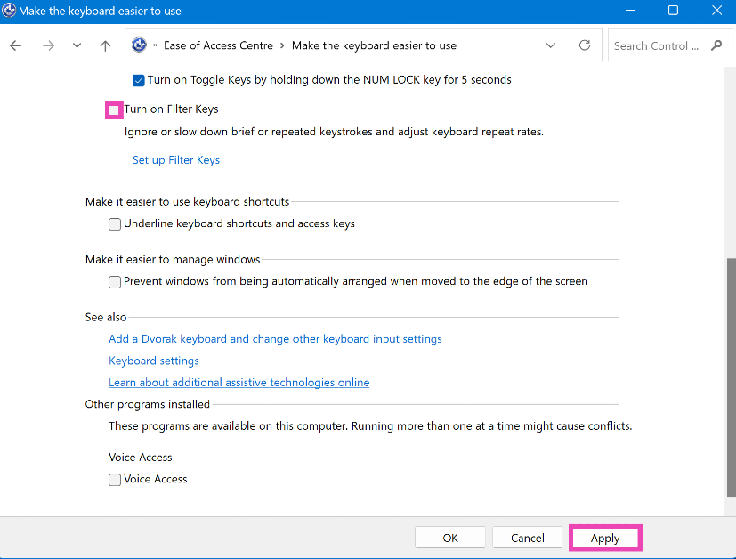 前往控制面板>轻松访问>更改键盘的工作方式,取消选择“打开过滤器键”并应用设置。