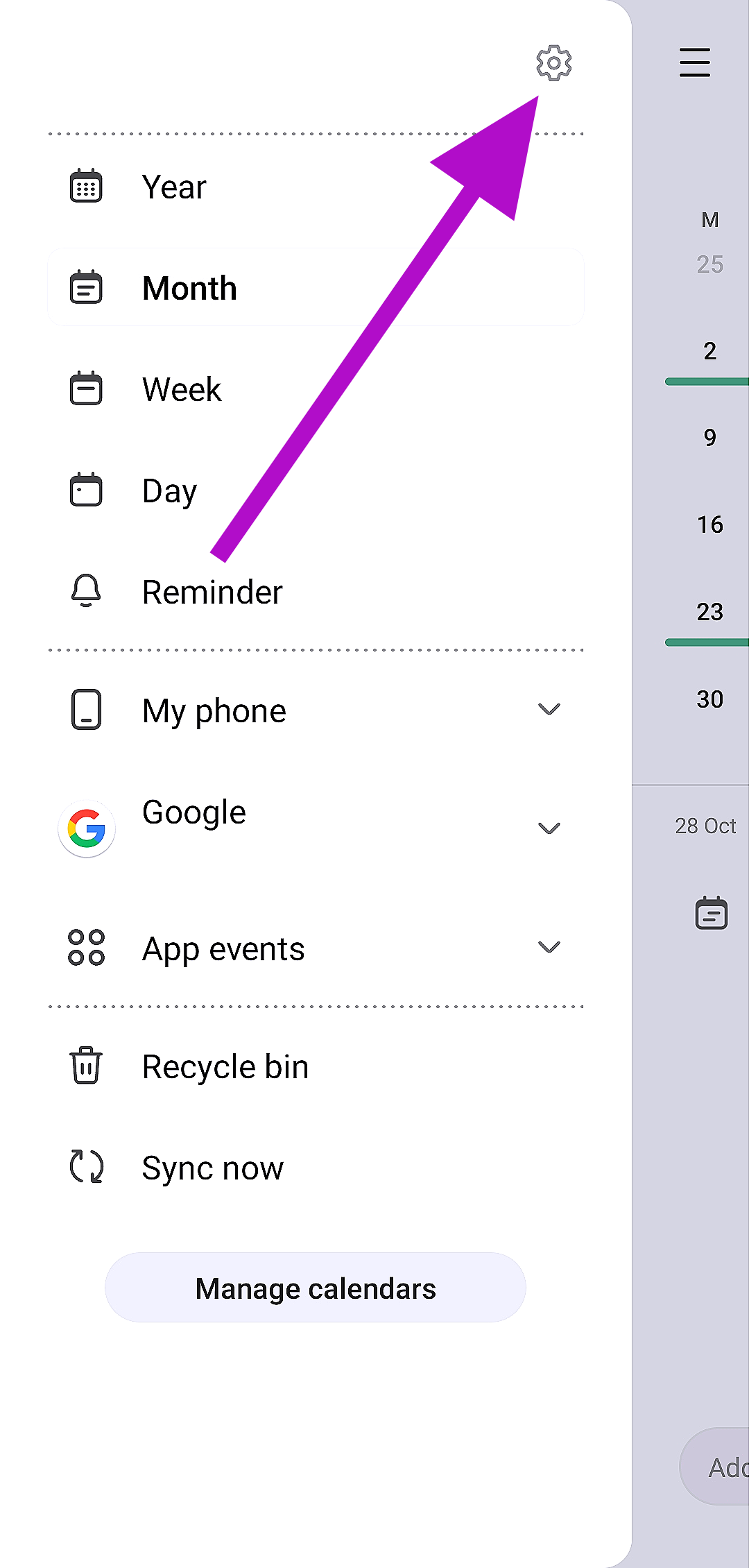 要开始同步,请转到三星日历应用程序,点击汉堡菜单,转到设置,然后打开 Google 帐户的切换开关。