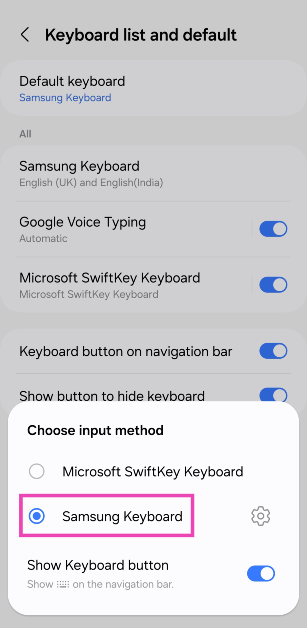 前往设置>常规管理>键盘列表和默认>默认键盘并选择三星键盘。