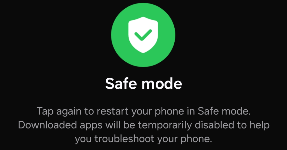 按住音量减小键和侧键可进入电源菜单。长按电源关闭图标,直到看到安全模式图标。点击此图标可在安全模式下重新启动手机。