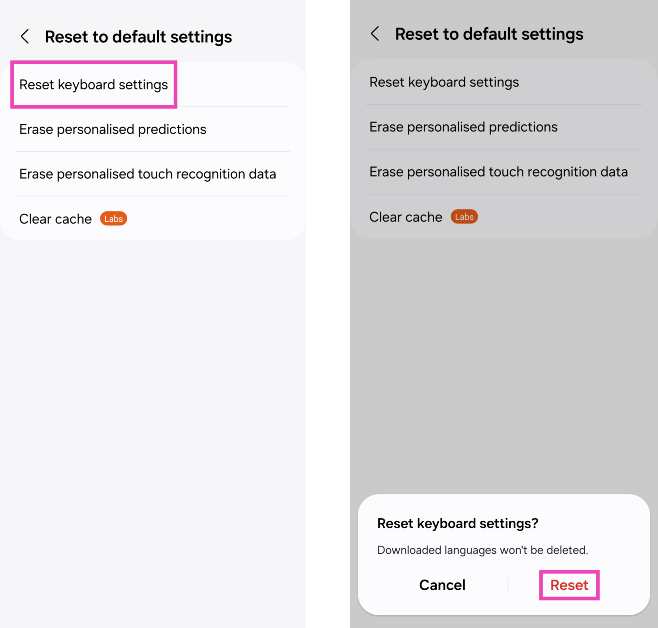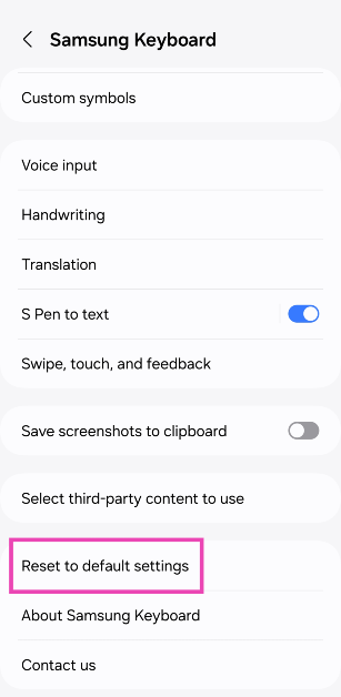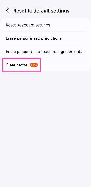 点击文本字段以触发三星键盘,点击设置图标,然后转到重置为默认设置>清除缓存。