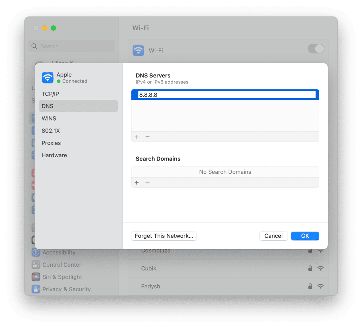 您的 Mac 现在将使用 Google 的 DNS 服务器来获取需要连接的网站的 IP 地址。尝试再次连接该网站。如果有效,您就会知道问题出在宽带的 DNS 服务器上。