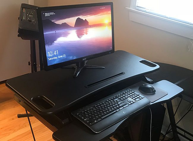 上面的图片显示了带有显示器、键盘和鼠标的桌子。这就是我在大多数情况下使用办公桌的方式,因此它可以让您真实地了解站立式办公桌工作站如何适应您的典型工作环境。当桌子处于坐姿时,键盘距我安装工作站的桌子表面约一英寸。这与我在安装工作站之前使用桌子的感觉非常相似,我什至不需要改变椅子的高度位置。