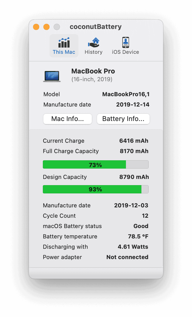 CoconutBattery 是另一个流行的选项,它不仅仅适用于您的 Mac。它还会显示有关 iPhone 和 iPad 电池的信息,包括电池寿命、充电周期和整体健康状况。它是一款简单而有效的工具,可用于监控所有 Apple 设备的电池情况。