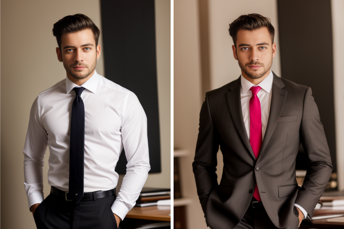 - 适合您的领域和行业的职业服装是首选,包括合身的套装、正装衬衫和领带。
