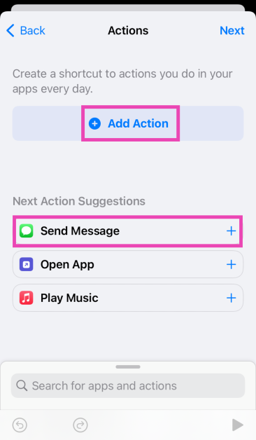 第7步:点击添加动作并选择发送消息。或者您可以直接选择发送消息从建议列表中。