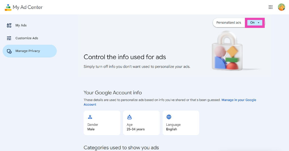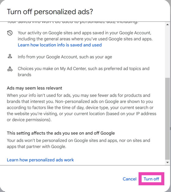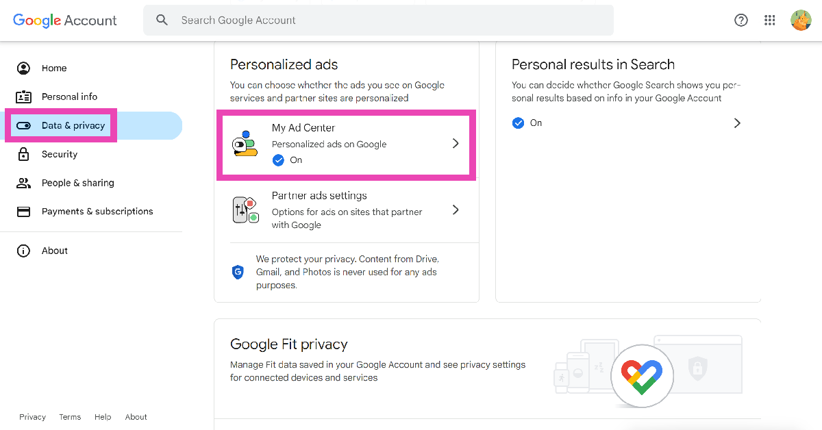 转到您的 Google 帐户并选择数据和隐私>我的广告中心>个性化广告并选择“关闭”。