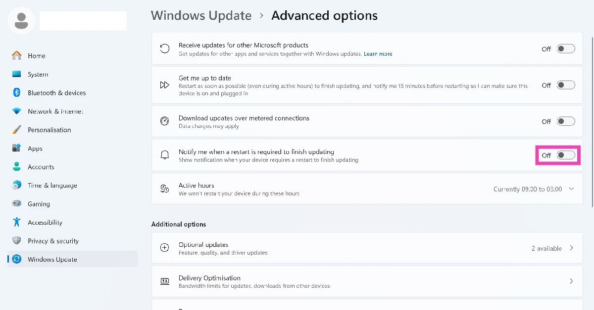 前往设置 > Windows 更新 > 高级选项并关闭“需要重新启动才能完成更新时通知我”旁边的切换开关。