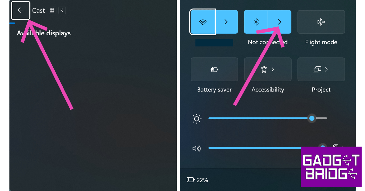 Windows 10 用户将记住将蓝牙耳机与电脑配对的超级简单方法。只需按 Windows + K 键,您就可以触发连接到 PC 的所有无线设备的面板。这包括外部显示器、无线耳机、键盘和鼠标。奇怪的是,Windows 11 仅提供按下该组合键后查看和连接无线显示器的选项。连接到其他蓝牙设备,您需要按后退按钮或按 Enter 键。尽管仍然涉及一个额外的步骤,但这仍然是快速将蓝牙耳机与 Windows 11 电脑配对的非常简单的方法。