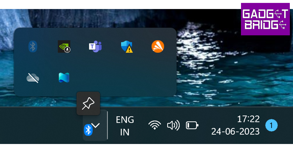 将蓝牙耳机与您的设备配对视窗11PC 需要访问设备设置并手动连接无线设备。您只需将蓝牙快捷方式固定在任务栏上即可避免额外的点击。单击任务栏右侧的箭头图标,然后将蓝牙图标拖回箭头以将其固定为快捷方式。现在,您只需双击该图标即可快速将蓝牙耳机与 Windows 11 电脑配对。
