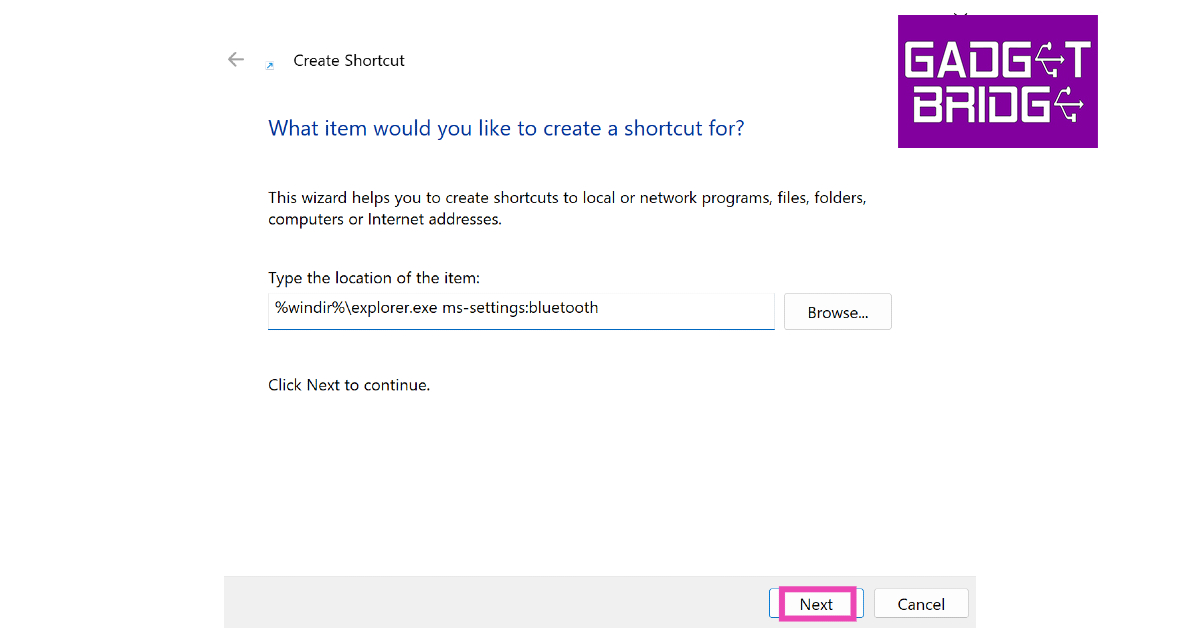 步骤2:在位置字段中输入此文本:%windir%explorer.exe ms-settings:蓝牙。