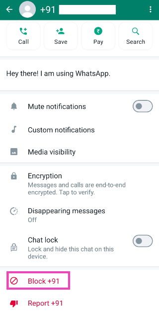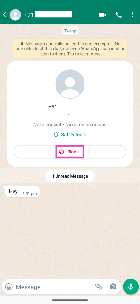 使用发件人 WhatsApp 个人资料上的阻止按钮
