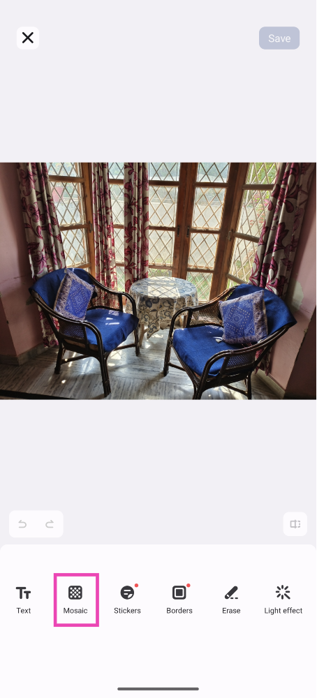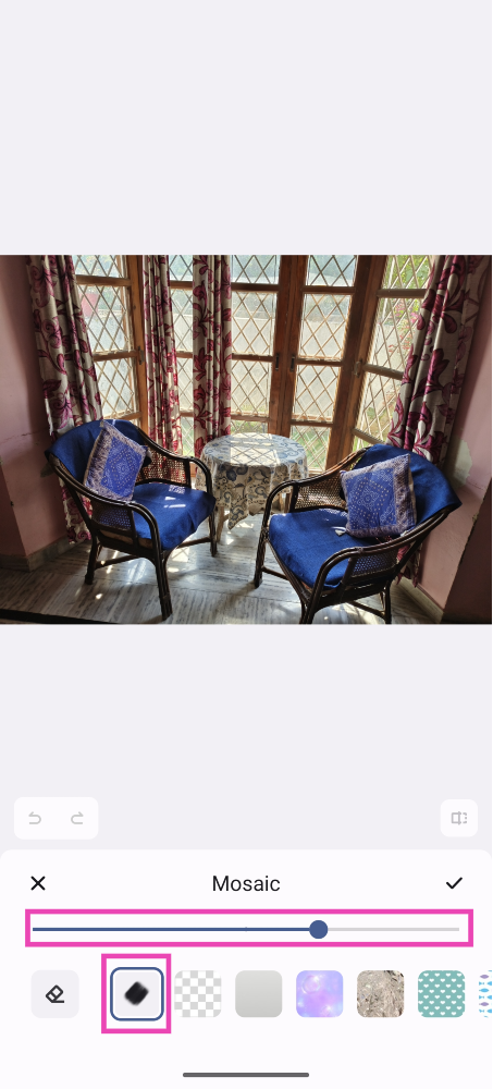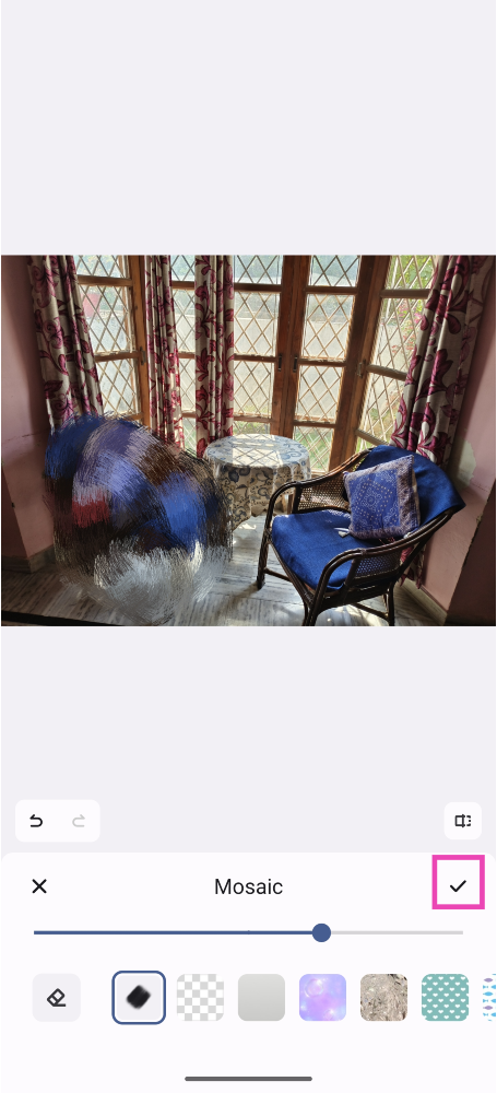 使用马赛克画笔工具模糊 Android 智能手机上图片的一部分。从选项列表中选择适当的模糊模式和强度级别。