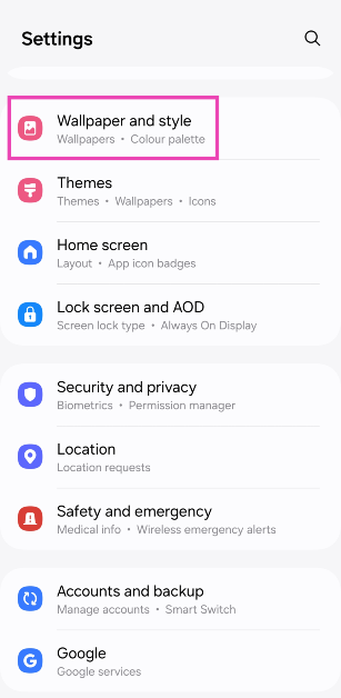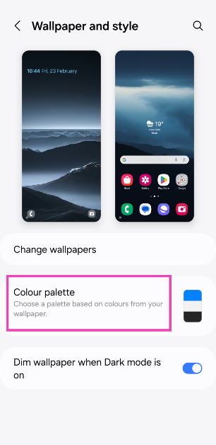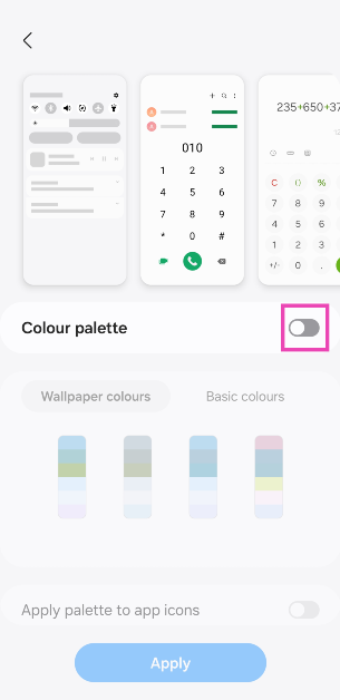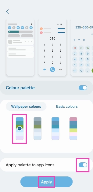 前往设置>壁纸和风格>调色板并打开“调色板”和“将调色板应用于应用程序图标”的切换开关。从列表中选择一种颜色。