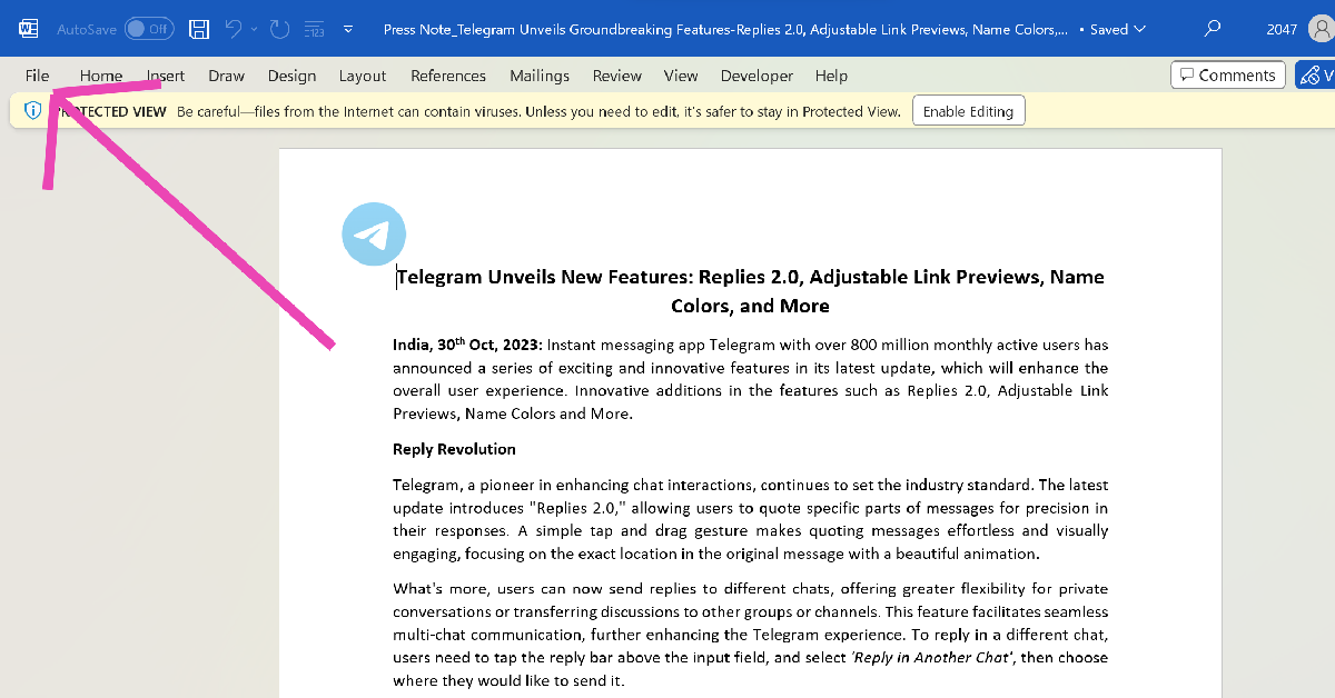 通过在以下位置打开从网络下载的文档来限制对其进行编辑受保护的视图。这样做是为了保护您的电脑免受病毒侵害。要删除 Word 中的编辑限制,请转到文件>信息并击中启用编辑在受保护的视图盒子。