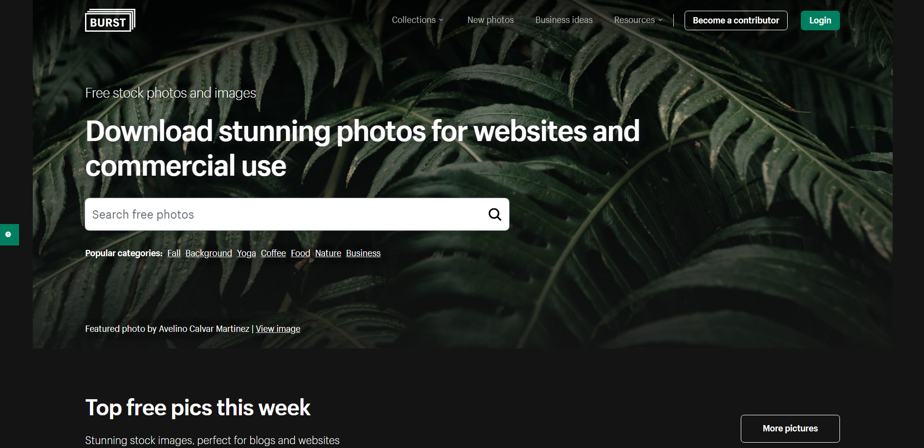 Burst 是一个面向商业和电子商务的图片网站。您可以将其用作 Unsplash 中广告类型图像的补充。 Burst是Shopify提供的免费图片平台,提供超过100万张专业照片,可免费用于商业用途。