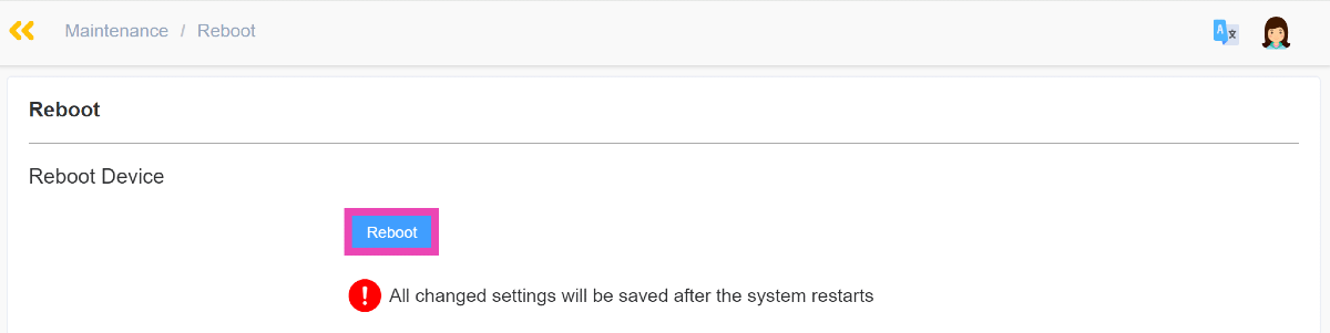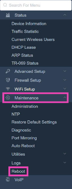 在网络浏览器中输入路由器的 IP 地址,转至路由器的管理门户。导航至维护>重启并点击“重新启动”。确认您的选择。