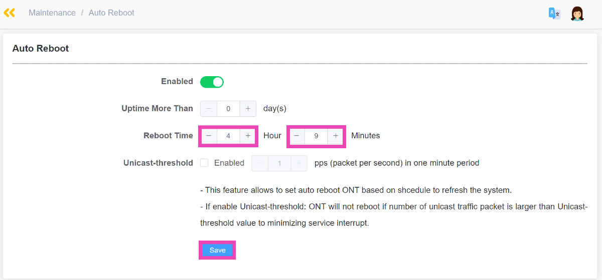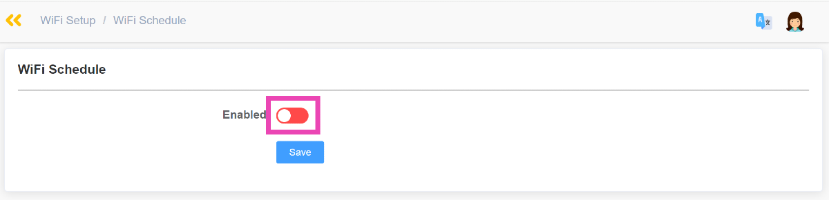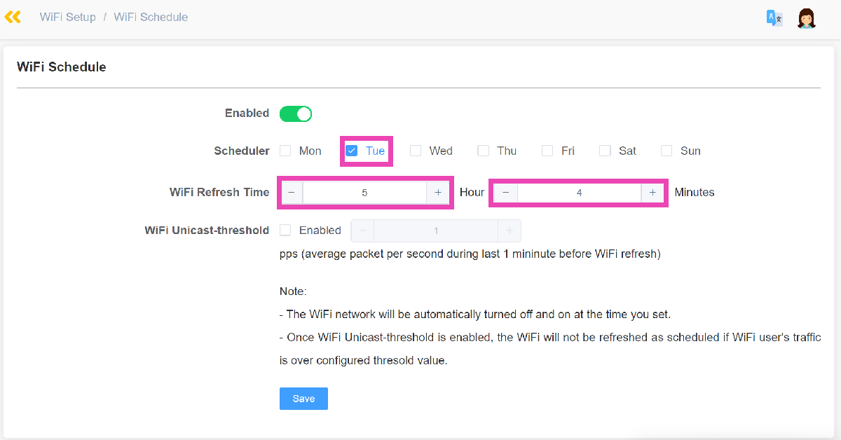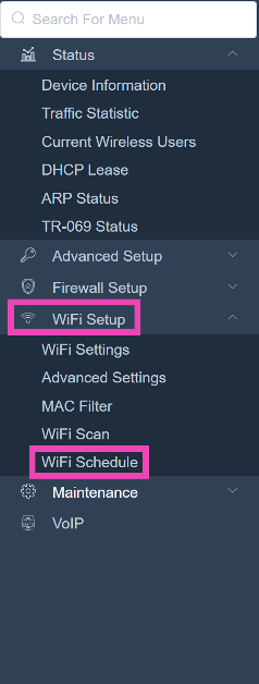 转到路由器的 Web 管理门户,导航到WiFi 设置>WiFi 时间表,打开“启用”切换开关,然后输入重新启动的日期和时间。