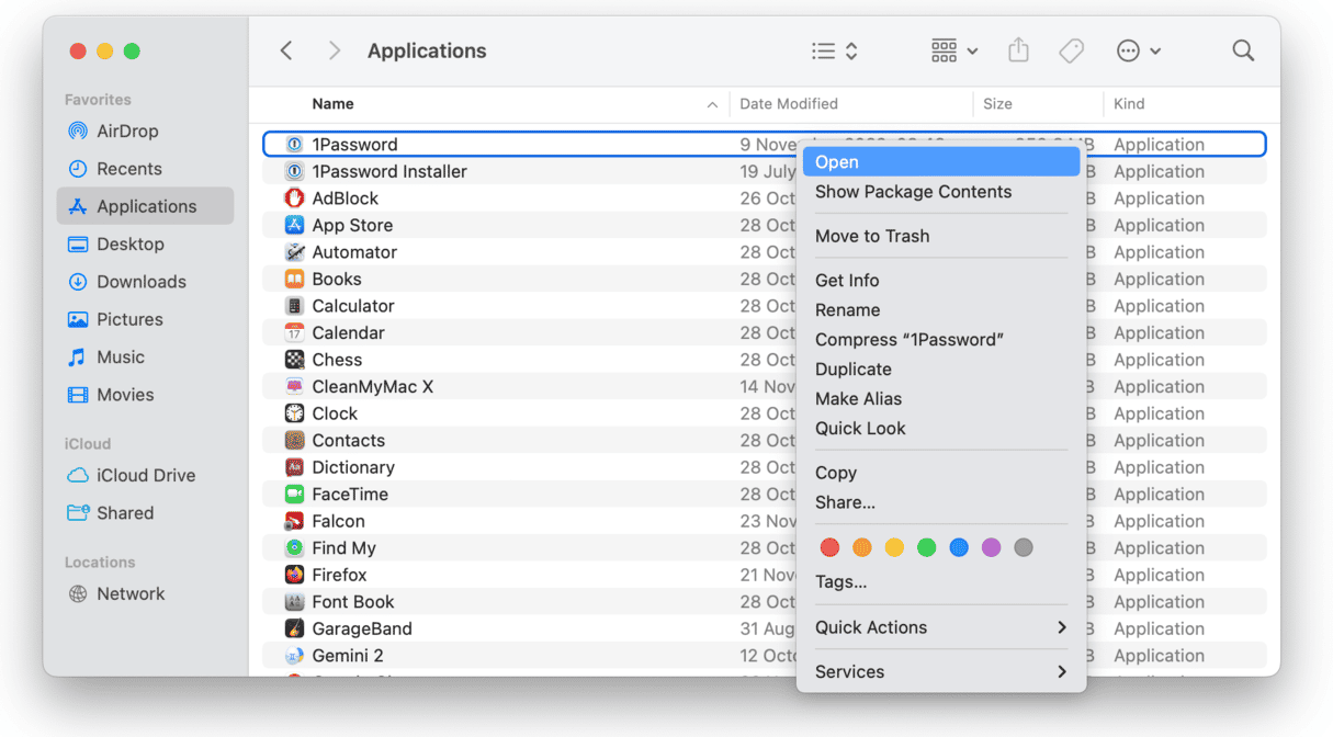 - 现在,按住 Control 键单击您想要打开的应用程序,然后从出现的菜单中选择“打开”。