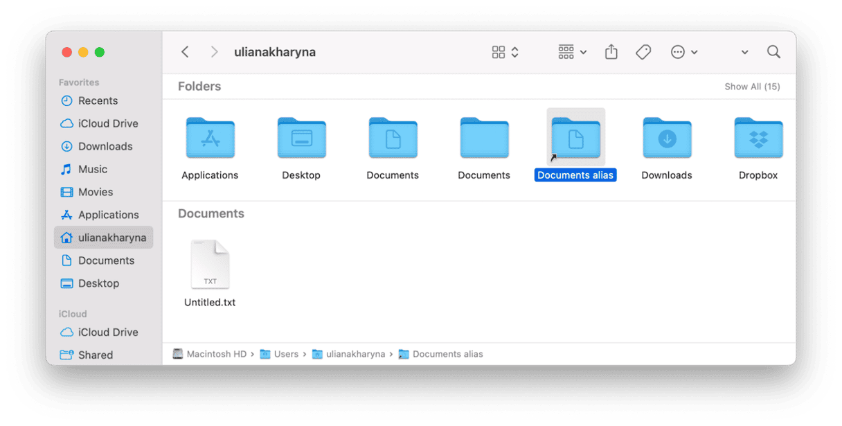 - 您将看到文件或文件夹的一个版本出现。它的图标左下角有一个箭头,名称末尾有“别名”一词。您可以将其拖动到任意位置,双击它时,您将看到文件夹的内容,或者文件将打开。
