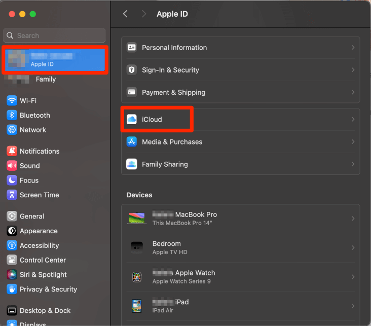 导航至苹果ID在左侧,然后选择iCloud在右侧。