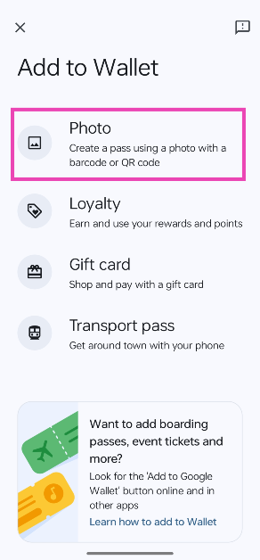 如果您的门票或通票有二维码,您可以将其添加到您的钱包中。 Pixel 用户只需截取登机牌的屏幕截图,然后点击屏幕截图预览工具栏中的“添加到钱包”选项即可。其他 Android 用户可以按照以下步骤操作。
