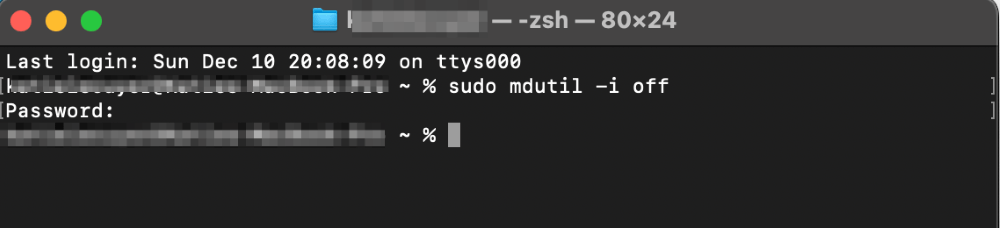 要禁用 Spotlight 索引,请键入以下命令并按 Enter 键: