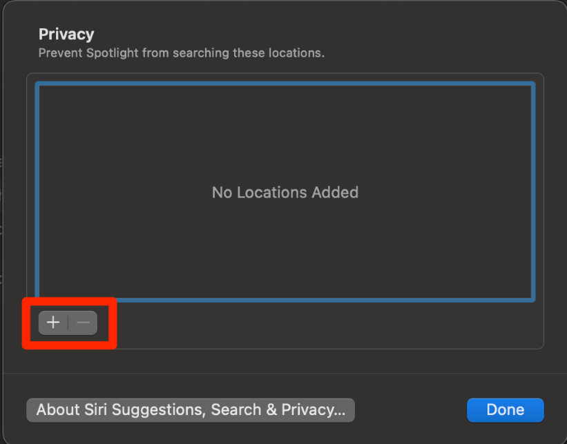 使用加按钮导航到并选择不需要 Spotlight 搜索的文件。