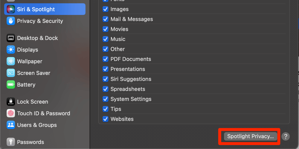 修复 #2:从 Spotlight 搜索中排除某些类别或文件
