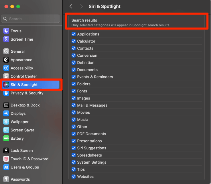 在左侧,导航至Siri 和聚光灯。下搜索结果部分,取消选择不需要 Spotlight 搜索的类别。