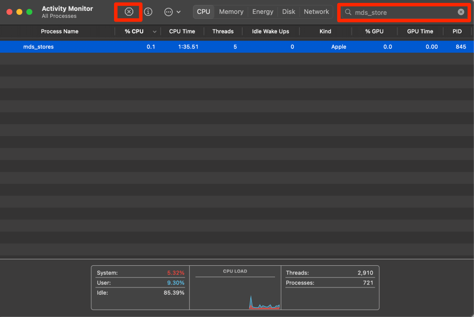活动监视器是一种很好的方法,不仅可以监视 Mac 上的各个进程,还可以重新启动它们。如果我们停止 mds_stores 进程,这可能有助于停止导致 CPU 使用率过高的任何问题,并允许进程完全重新启动。
