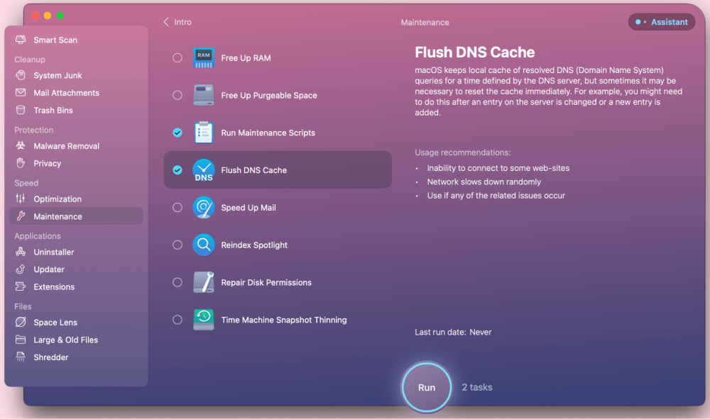 下载并安装该应用程序,然后首次启动它。要运行维护任务,请从左侧边栏中选择“维护”选项。在这里,您可以执行释放 RAM、刷新 DNS 缓存或运行维护脚本等操作。