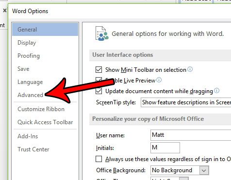 第 4 步:单击先进的左栏中的选项卡单词选项窗户。