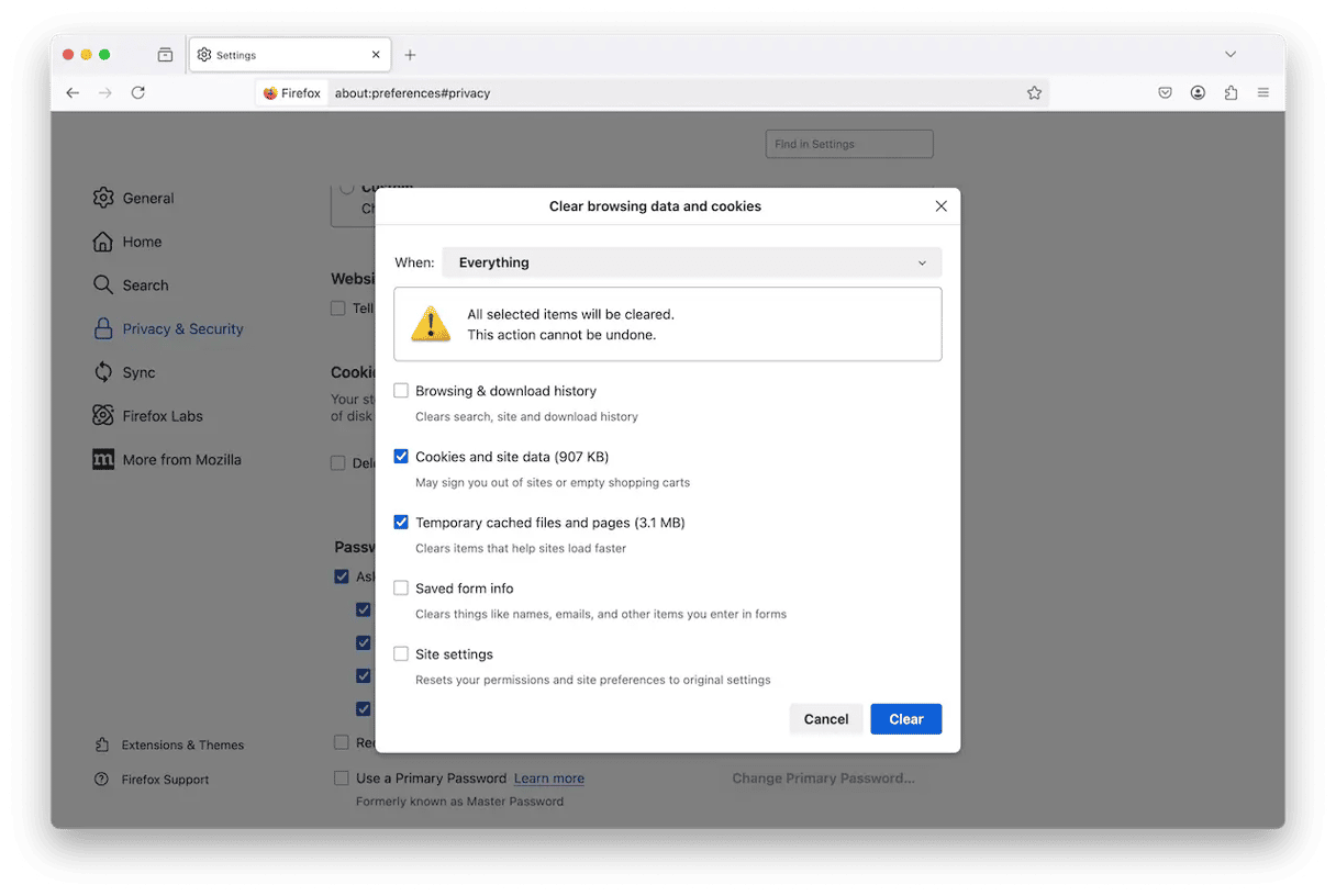 - 设置 > 隐私和安全。删除所有缓存和临时 Internet 文件。
