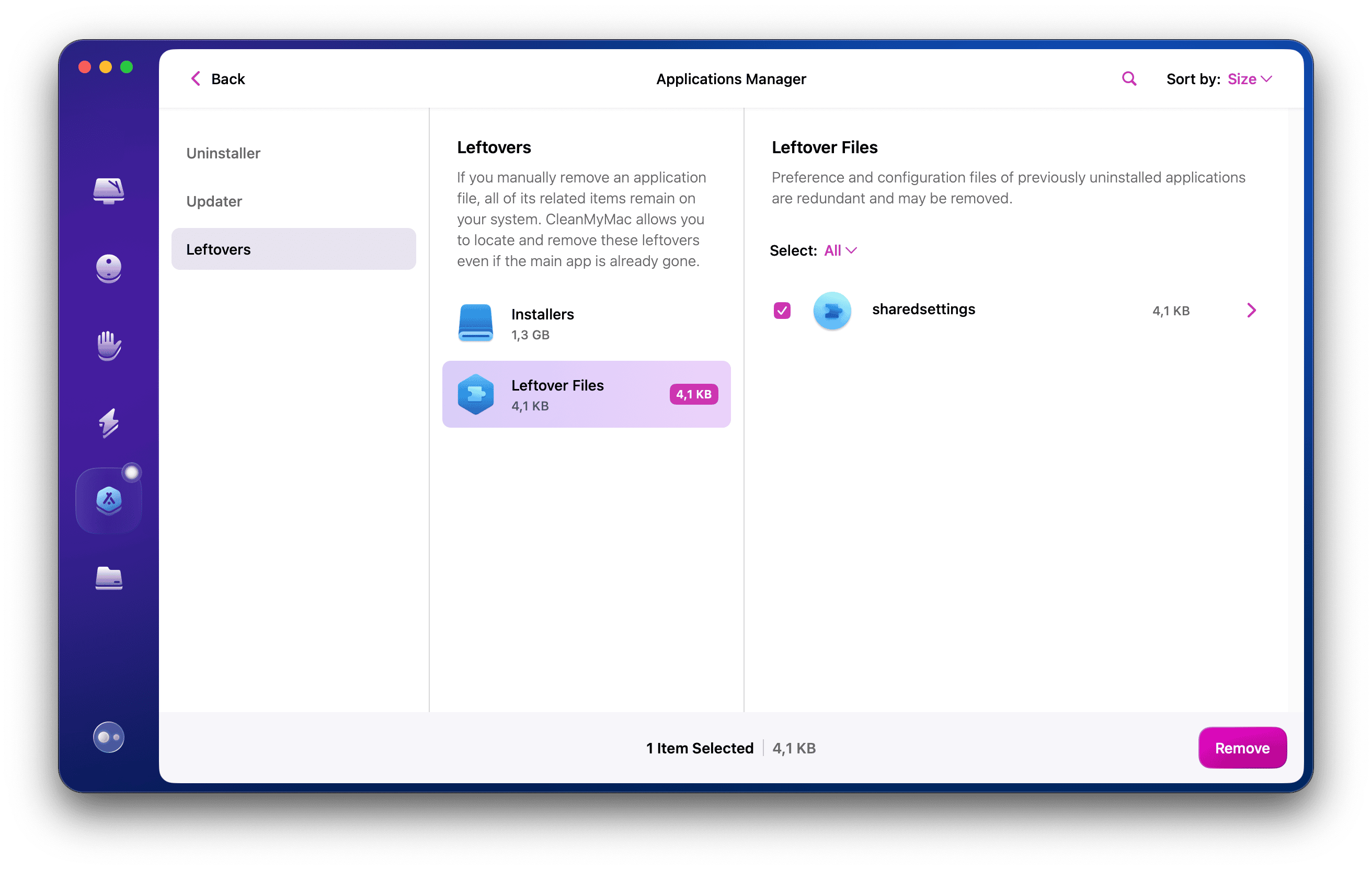- 选择“剩菜”,选择要删除的所有应用程序剩菜,然后单击“删除”。