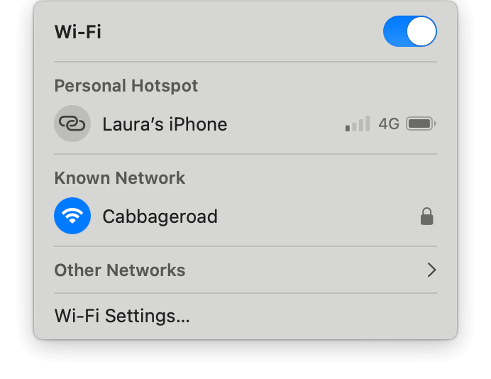 - 从顶部 Wi-Fi 菜单打开和关闭 Wi-Fi。
