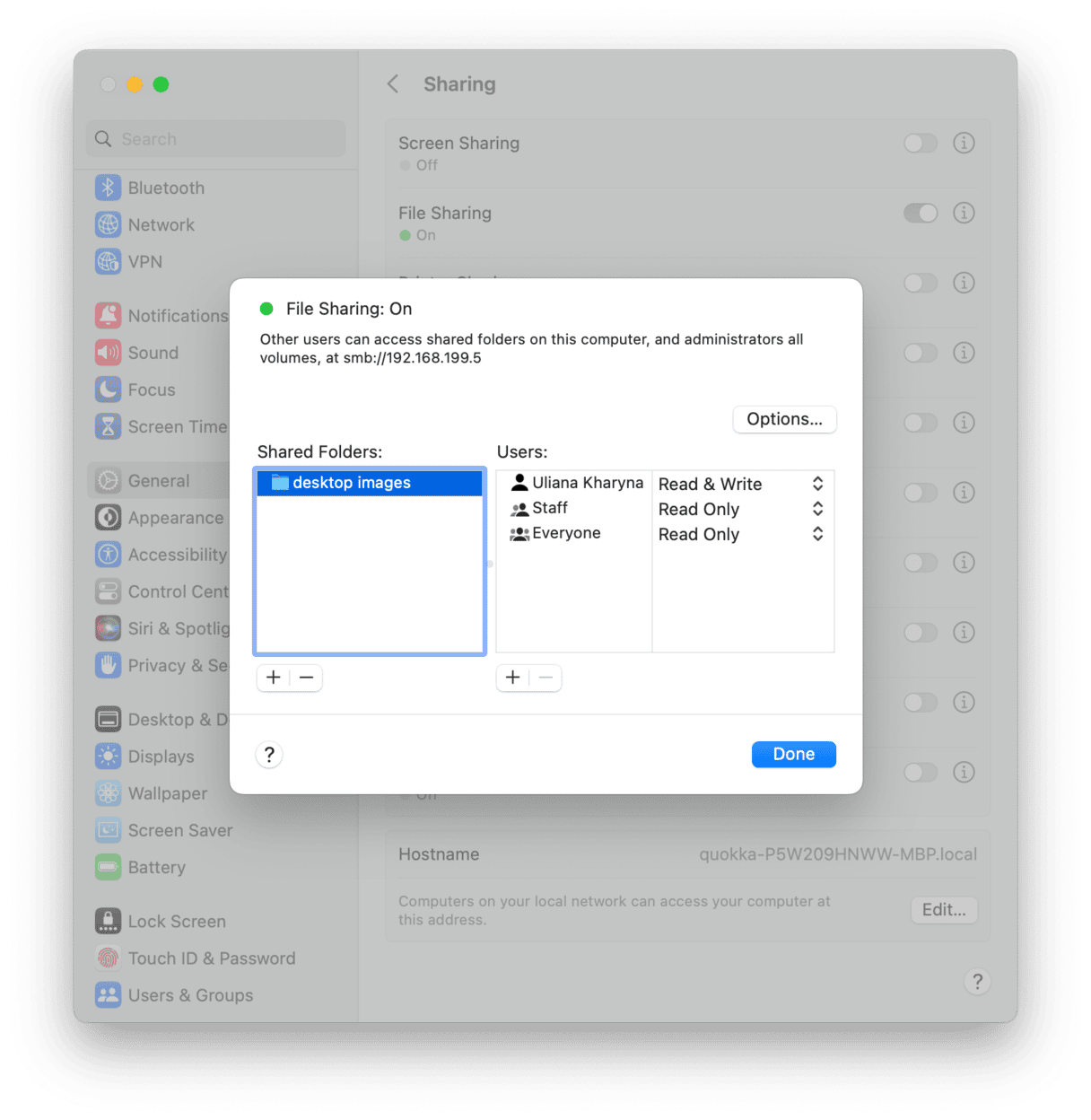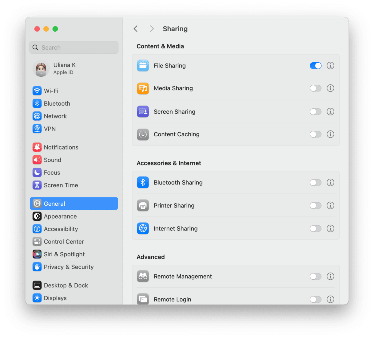 - 关闭文件共享,然后再次打开。这是你应该尝试的第一件事。只需转到“系统设置”>“常规”>“共享”,然后在列表中找到“文件共享”。使用切换开关将其关闭,然后再次打开。
