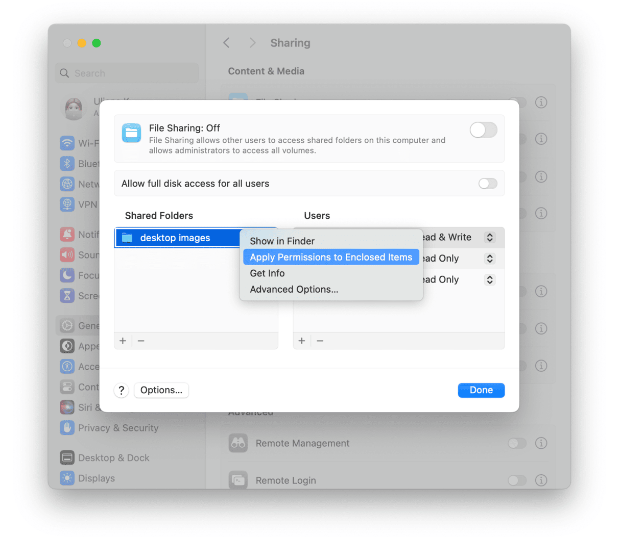 正如我们上面所解释的,Mac 上的文件共享是基于 Unix 构建的,它使用权限系统。如果您无法访问所需的文件或文件夹,则可能是权限问题。共享文件夹中的文件不会自动继承与该文件夹相同的权限。要将授予文件夹的权限应用到其中的所有文件,请在“系统设置”>“常规”>“共享”>“文件共享”中右键单击该文件夹,然后选择“将权限应用于所包含的项目”。